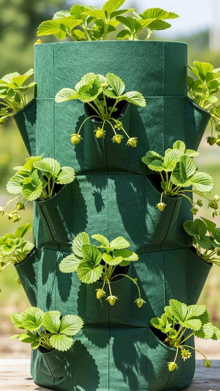 Pocketed grow bags help strawberries spread. Fill the bag slowly and tuck plants into the pockets. Place it where it gets gentle sun. Water from the top so moisture travels down. The pockets make it easy to harvest berries at different heights. You can hang the bag or set it near a fence. This idea works well for small patios and avoids messy ground patches.