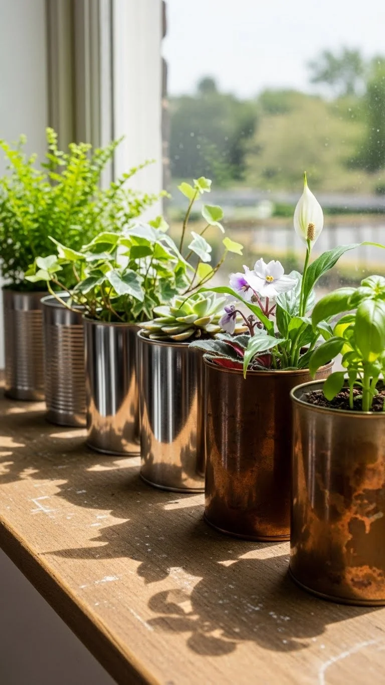 Metal tins add style without much work. They fit small indoor plants like pothos, herbs, or peperomia. Add drainage holes and a small saucer underneath. Tins reflect light, making windowsills feel brighter. If the metal gets too warm, wrap twine or cloth around the outside. They’re easy to repurpose from pantry items. You can group tins to create a cozy indoor garden.