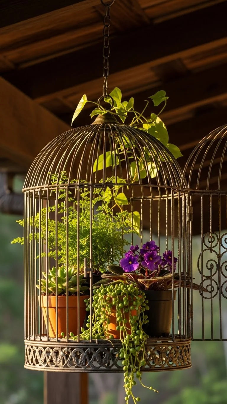 A birdcage makes a charming planter. Place small pots inside instead of filling it with soil. Hang it from a porch beam or tree branch. Trailing plants look lovely as they spill through the bars. You can paint the cage or keep its natural patina. It turns a simple corner into a focal point. It works best for shade-loving plants because cages don’t hold large soil amounts.