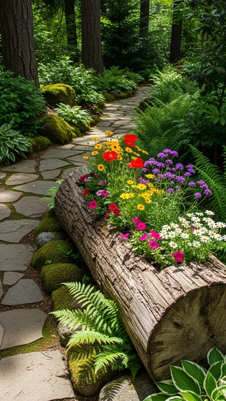 A hollow log creates a natural planter. Scoop out the center, fill it with soil, and add flowers or ferns. Logs stay moist longer and blend easily into garden areas. They work well in shady corners or along walkways. Logs can be found for free after trimming trees. Because they’re heavy, place them where you want them before filling. This idea adds warmth and texture to outdoor spaces.