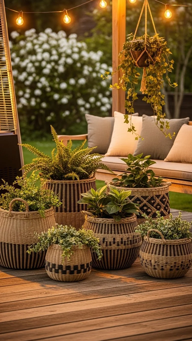 Woven baskets soften any space. They’re light and easy to move. Line them with plastic bags to keep soil in place. Add potted plants inside so you can remove them when watering. Baskets look great with leafy indoor plants or soft outdoor flowers. They bring a warm feel to porches or living rooms. Keep them out of constant rain so they last longer.