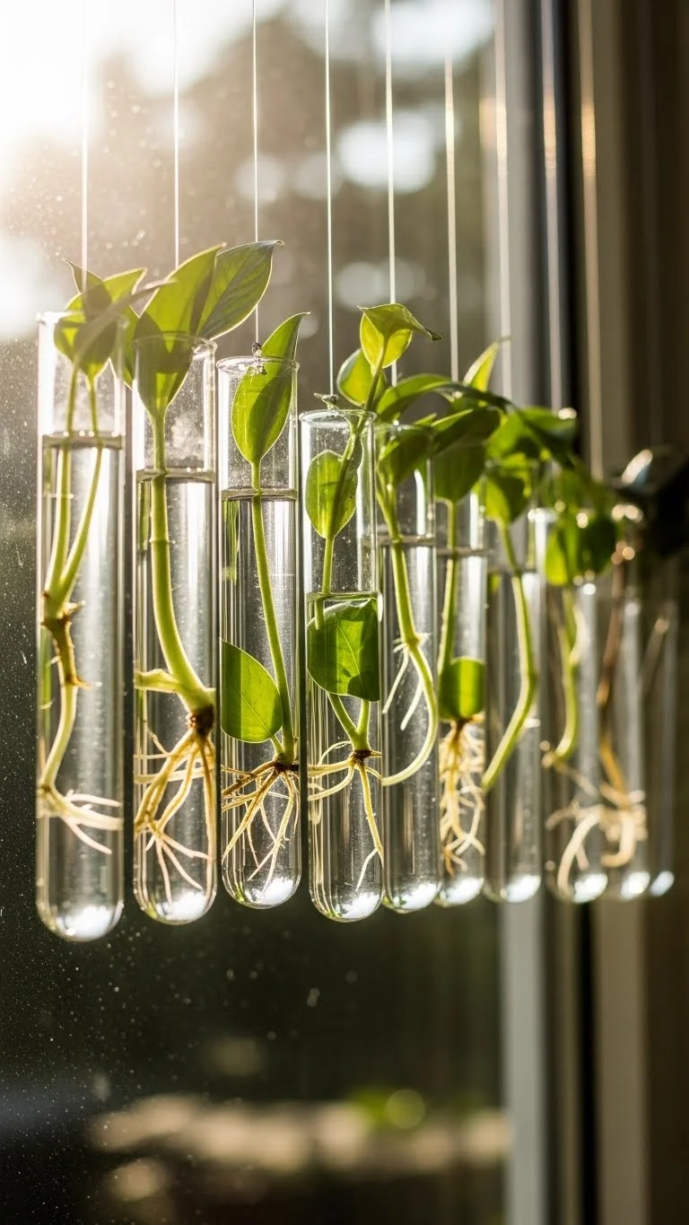 Test tubes make propagation fun. Place one cutting in each tube and hang them in a row. They catch natural light and show off the roots as they grow. This works well for plants like pothos or philodendron. Replace the water every few days. You can hang them with twine or place them on a small rack. It’s a low-cost way to grow new plants.
