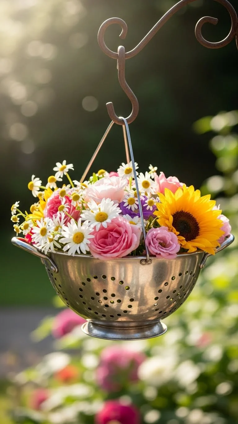 A colander gives instant drainage. Line it lightly with moss or fabric, then add soil. Plant hardy flowers or herbs. Hang it using the side handles or place it on a table. Water flows easily, so plants stay healthy. Colanders add charm and come in many colors. You can find them cheap at thrift shops.