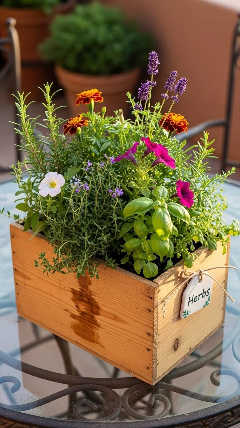 Wine boxes offer a long, shallow space for mixed plantings. Add a plastic liner and soil. Combine flowers with herbs for a pretty blend. These boxes look great on balconies or porches. Because they’re lightweight, you can move them often. Keep watering light so the wood stays dry. Wine shops often give them away for free.