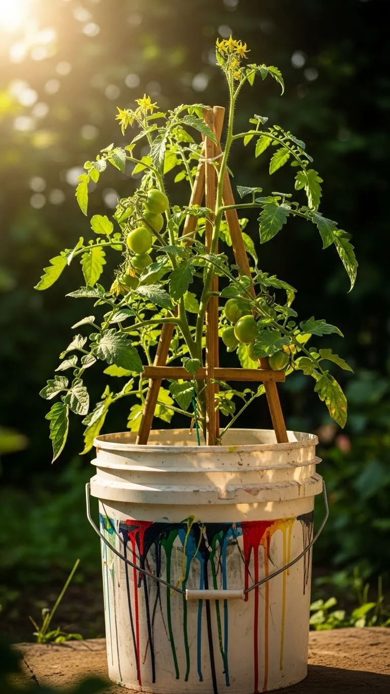 Paint buckets are perfect for deep-rooted plants. Wash them well, then drill drainage holes. Add soil and a small trellis for support. Place the bucket near strong light. Tomatoes grow well with steady watering. Buckets don’t cost much and last years. You can label them or paint them for style.