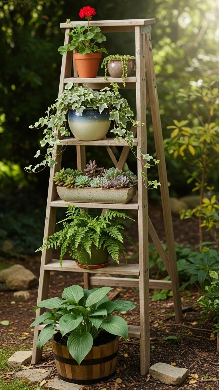 A ladder shelf gives you vertical planting space. Place one pot on each step. Trailing plants work well on the top steps, and fuller plants fit lower. This setup fits well on balconies or patios. You can repaint the ladder or leave it worn. It keeps plants organized and easy to reach.
