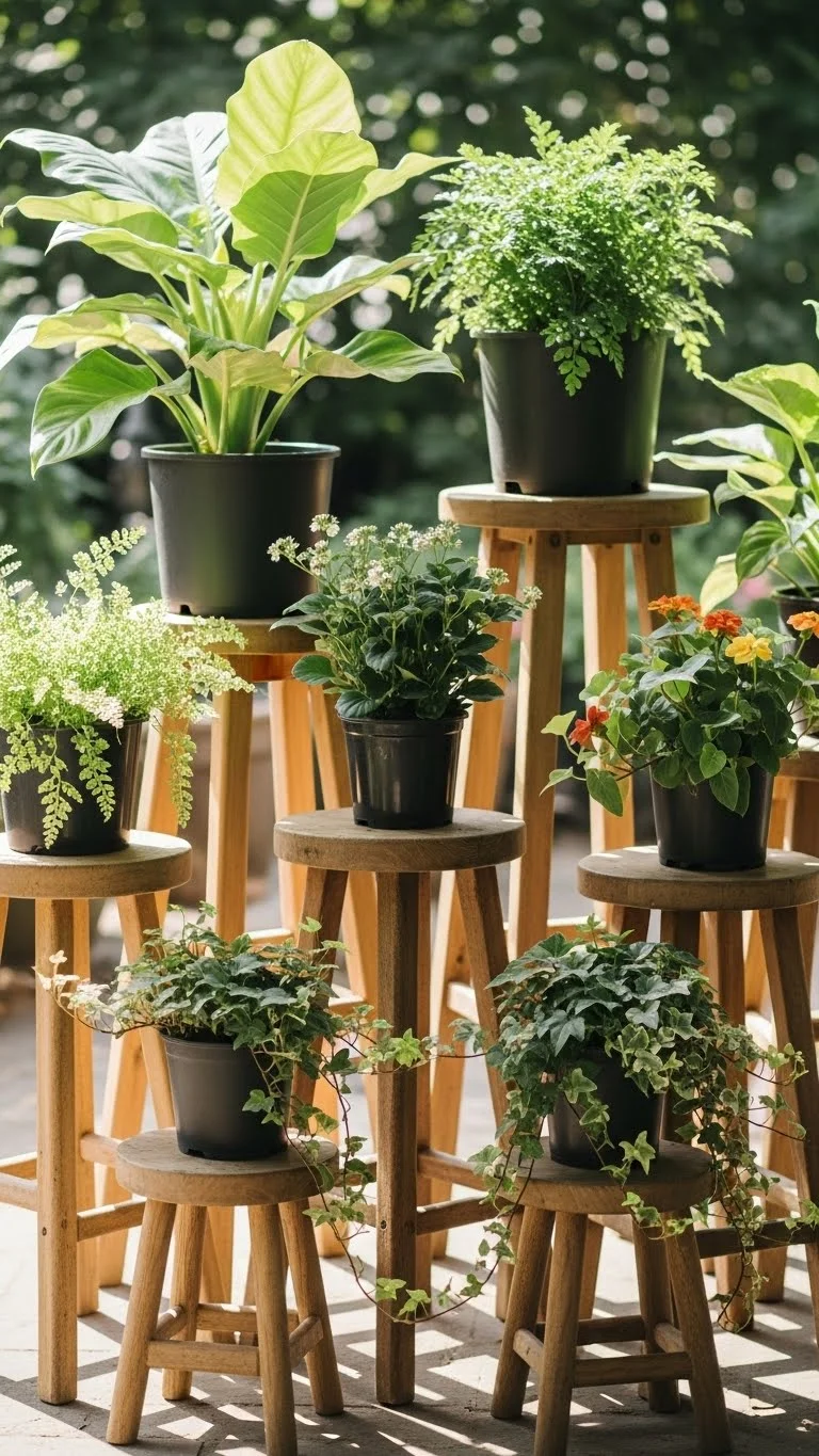 Using stools helps you arrange plants at different heights. It gives your patio or balcony a fuller look without clutter. Use one tall stool, one medium, and one short. Place leafy plants on the tallest stool to anchor the space. Put trailing plants on the lowest for a cascading effect. The middle stool can hold herbs or flowers. You can repaint stools or leave them natural for a rustic look. This layered style draws the eye upward and makes small spaces feel organized. It’s affordable and easy to adjust as your plants grow.