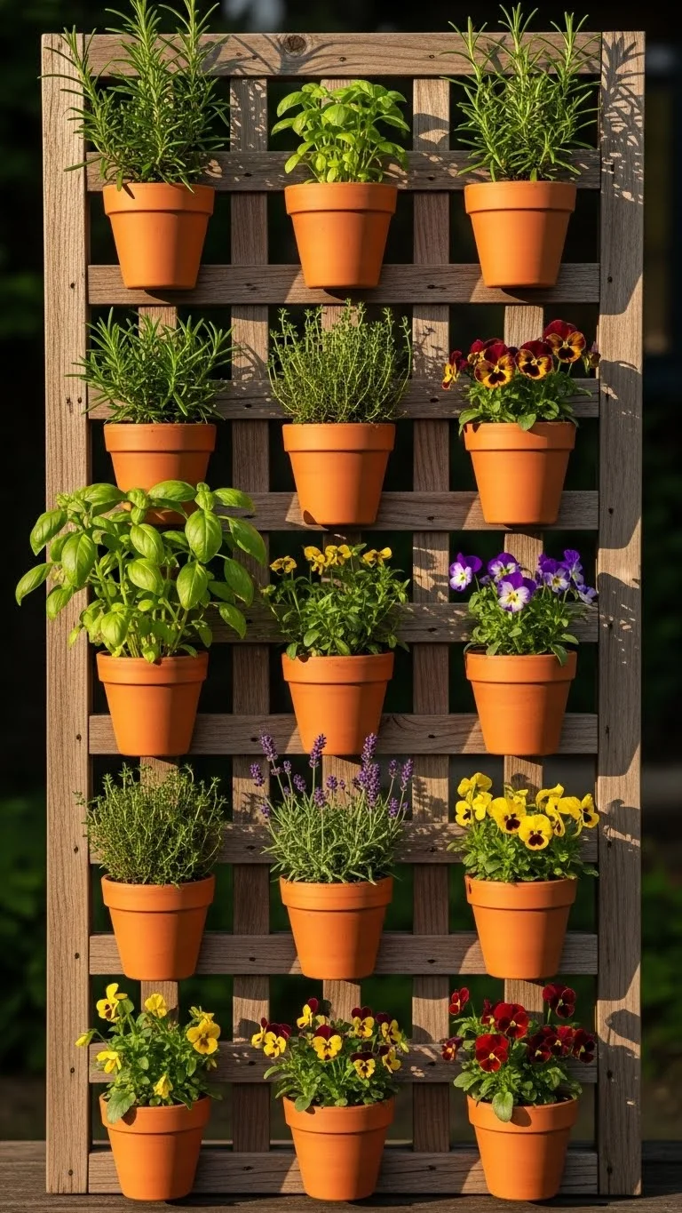 A simple lattice panel turns any bare wall into a planting zone. Attach hooks and hang small terracotta pots. Start with herbs or trailing flowers because they stay light. Space the pots evenly so they don’t crowd. This setup works well for renters because you can lean the panel instead of drilling it into the wall. It saves ground space and brings plants to eye level. Water lightly so the pots don’t drip onto lower rows. It’s an easy way to brighten a dull wall on a budget.