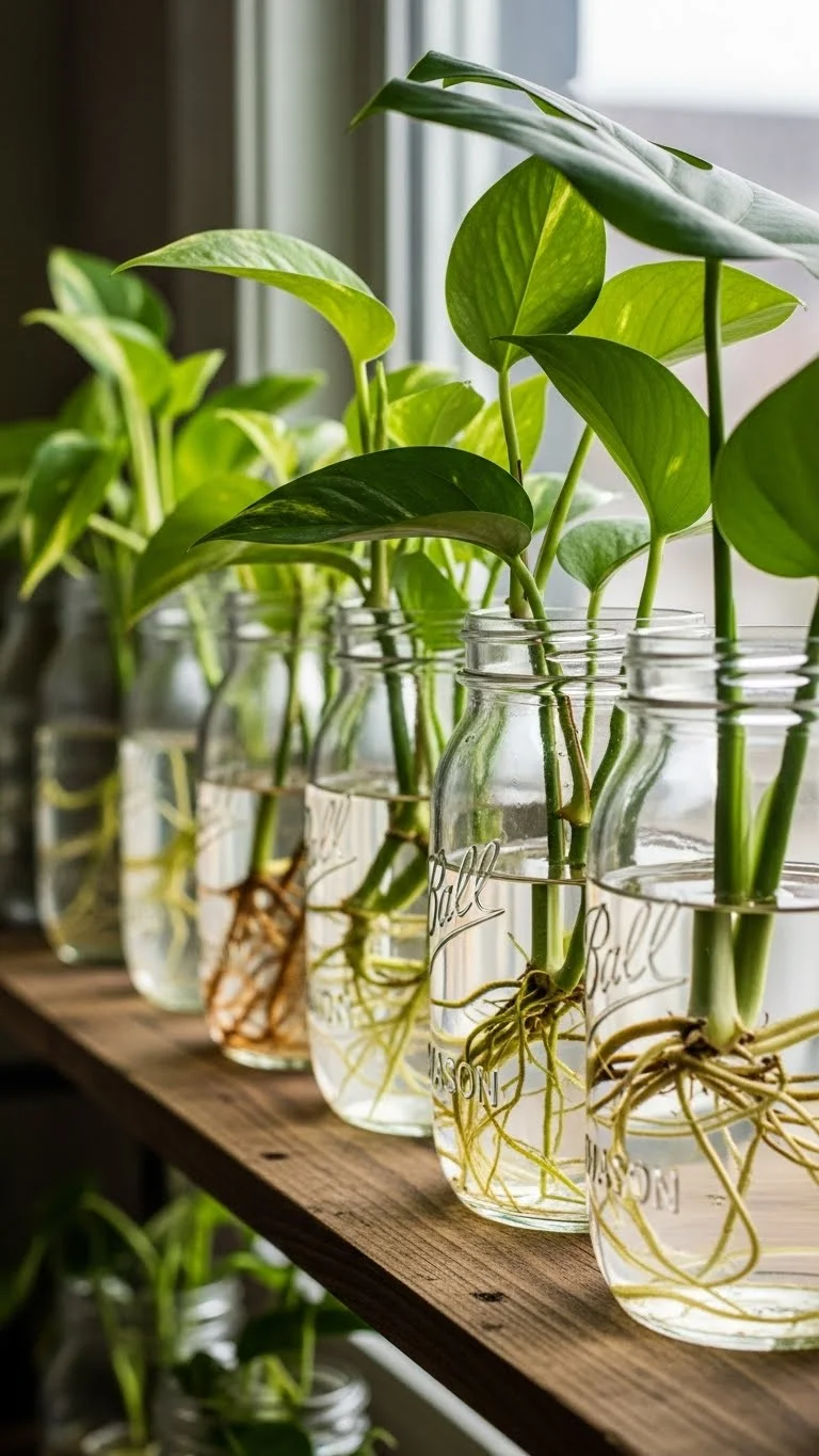 Mason jars work well for rooting cuttings. You can grow pothos, basil, mint, or coleus. Fill jars with clean water and place one cutting in each. Set them near a bright window. Change the water weekly to keep it clear. This is a low-cost way to expand your plant collection. When roots grow long, transfer them to soil. If you like a softer style, wrap twine around the jar rims. You can also group jars in a tray to keep them organized. It’s a simple project that looks pretty.