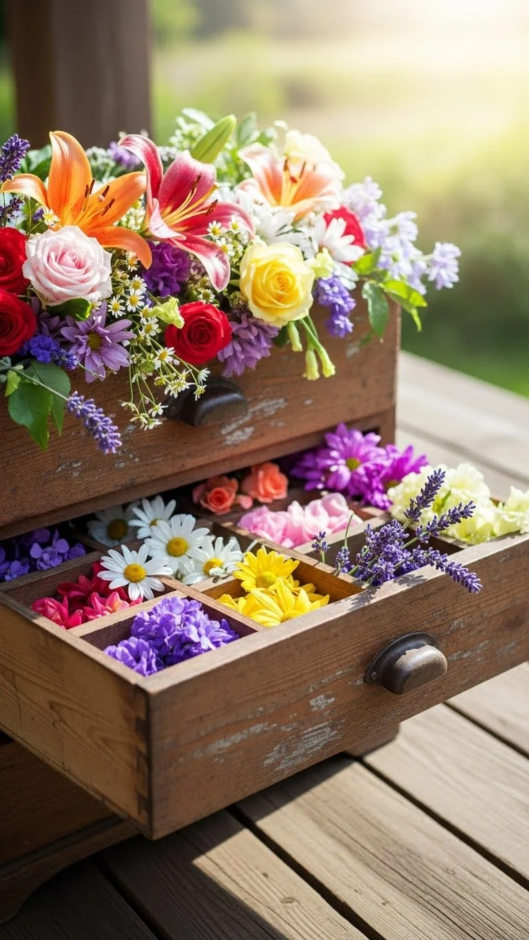 Old drawers make charming planters. Line the bottom with plastic to protect the wood. Add soil and choose low-growing flowers like pansies or marigolds. You can set the drawer on the ground or place it on a bench for height. Drawers create a cozy, handmade look that feels welcoming. If the wood is worn, leave it as is for character. Water carefully so the drawer doesn’t stay soggy. It’s a fun way to reuse furniture headed for the trash.