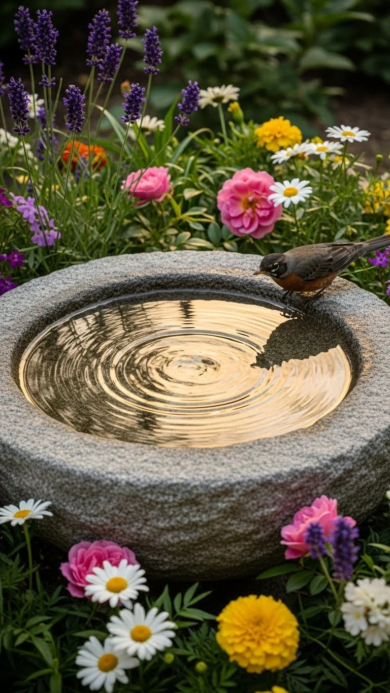 A bird bath brings gentle movement to your garden. Use a shallow dish on a stand or a wide bowl on a stump. Fill it with clean water. Change the water every few days. Place it where you can see it from a window. Birds will visit often. It creates a lively corner and helps local wildlife. It also gives your garden a peaceful feel.