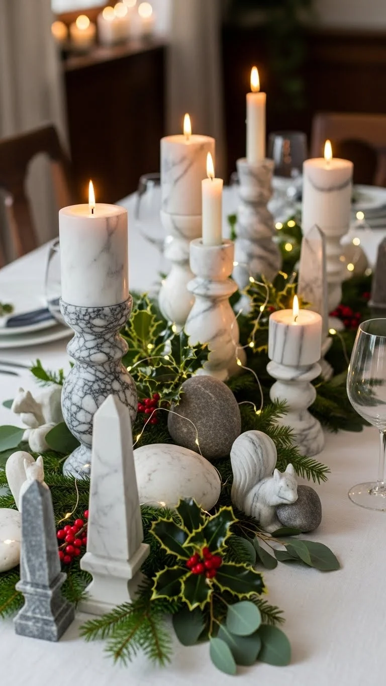 Adding stone textures creates a grounded feel. Use marble candle holders, coasters, or serving trays. These pieces pair well with metallic ornaments and greenery. You can also find faux marble items that look convincing without a high price. Keep the arrangement simple so each piece stands out. Pair the stone with soft fabrics to balance it. The contrast brings richness to the room.
