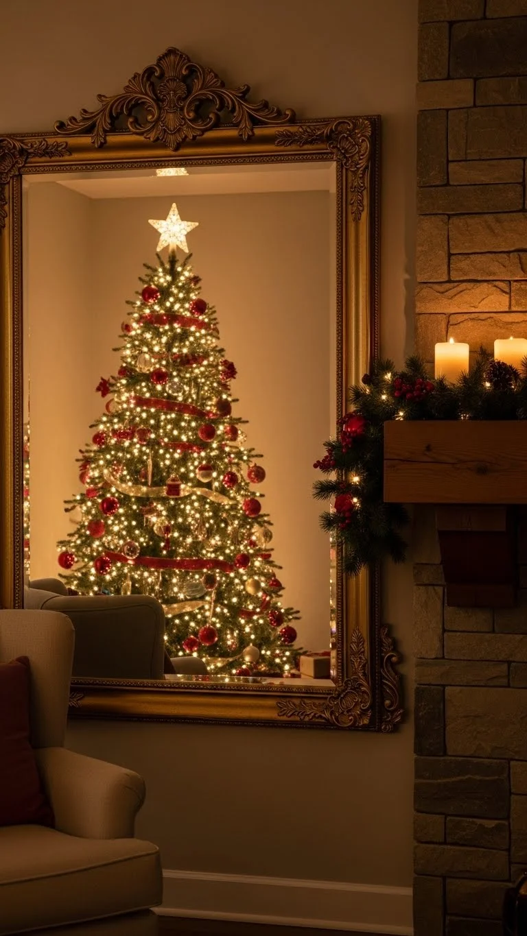 Mirrors amplify lights and decor. Choose a gold-framed mirror and place it where it can reflect your tree or garland. You can find affordable frames at secondhand shops and spray them gold. The warm metallic edge adds polish. Keep the area around the mirror uncluttered so the reflection becomes the highlight. This trick makes your room look larger and more refined at night.