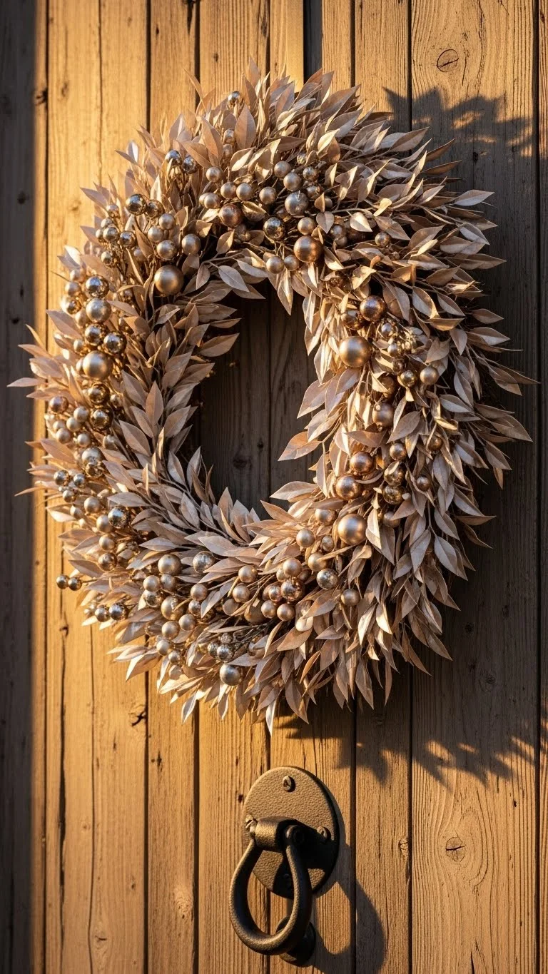 A champagne wreath gives a soft, glamorous look without being overwhelming. Use metallic leaves, frosted branches, or pearl-like accents. Hang it with a velvet ribbon for added texture. If you’re on a budget, spray a basic green wreath with champagne-colored paint. Keep the design simple—too many ornaments take away from the elegance. This style works on both dark and light doors.