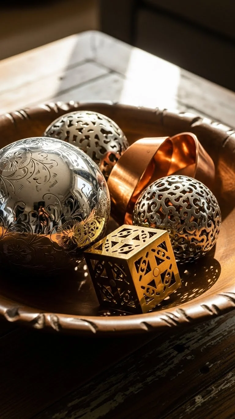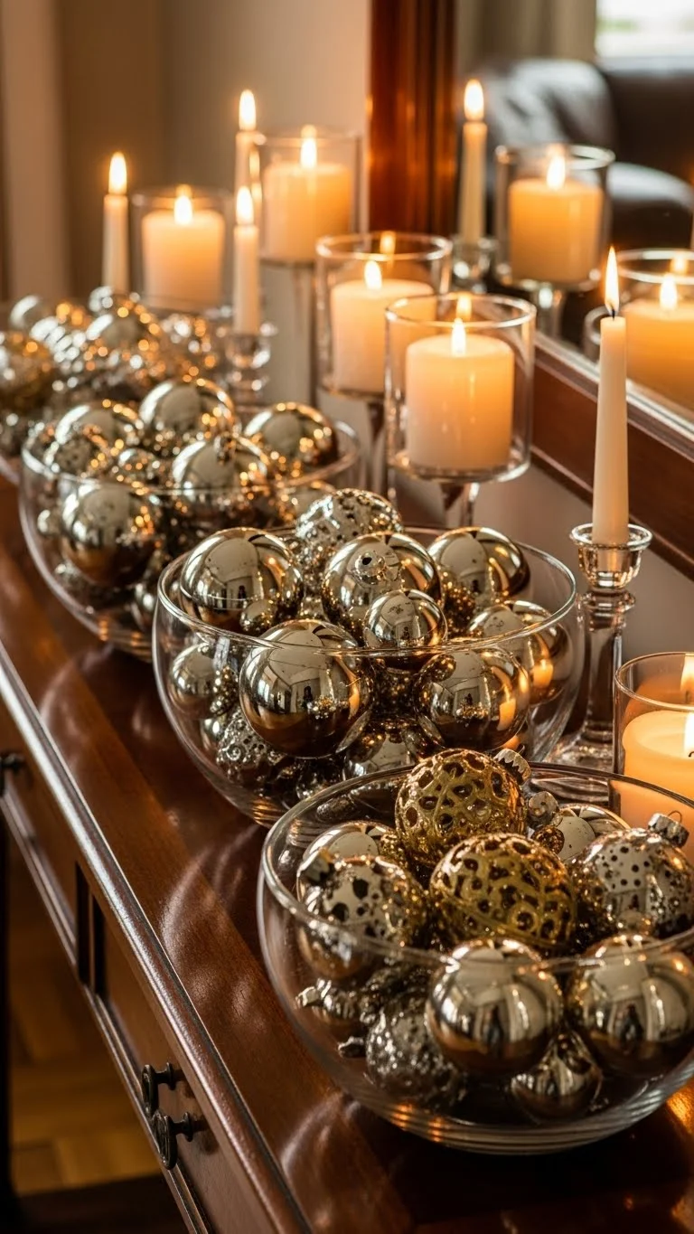 Clear bowls filled with coordinated ornaments create easy luxury. Use ornaments in gold, silver, rose gold, or pearl tones. Mix matte and shiny textures for depth. Place the bowls on coffee tables, entry tables, or bookshelves. It’s an easy way to tie different areas of your home together. You can reuse old ornaments and spray them to match your theme. Simple, affordable, elegant.