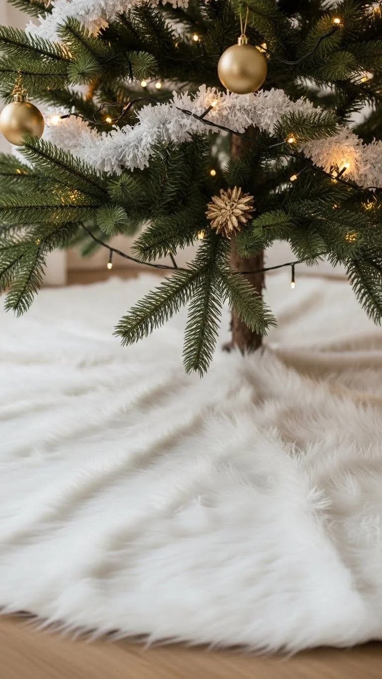 A plush tree skirt changes the entire feel of the tree area. Choose faux fur or thick knit fabrics. Stick with neutral colors for a polished look. If you want to DIY, cut a circle from faux fur fabric and leave the edges raw—they still look great. The softness contrasts beautifully with metallic ornaments and lights. It also hides tree stands in a clean, stylish way.