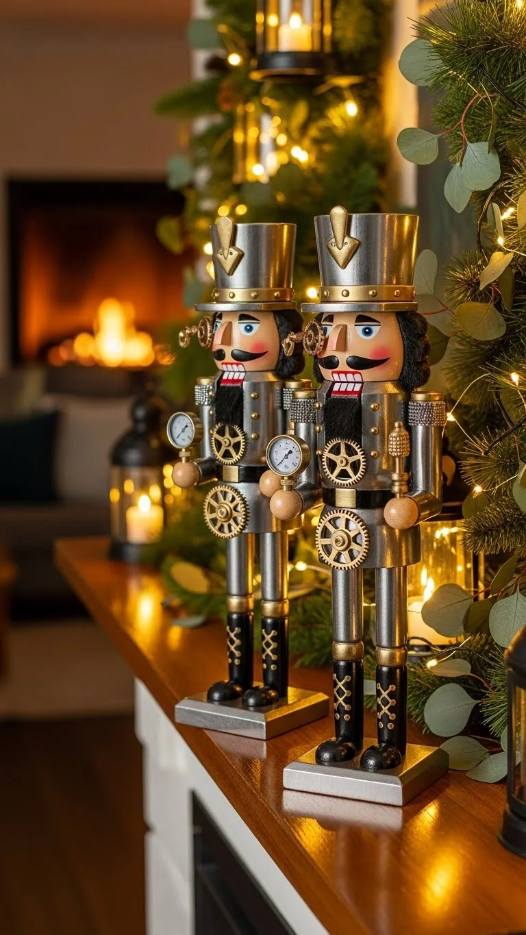Nutcrackers feel timeless. Choose metallic ones in gold, bronze, or silver. Place them on the mantel or beside the tree. You can also spray-paint inexpensive wooden nutcrackers to match your theme. Keep the rest of the area simple so the figures stand out. They add height and a touch of tradition without feeling dated.