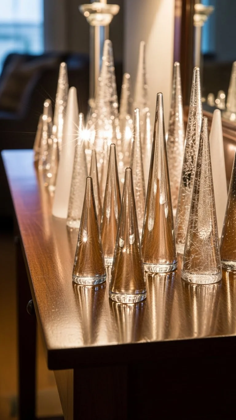 Glass trees look delicate and polished. Place a few on shelves, mantels, or dining tables. Choose sizes that vary for a balanced arrangement. You can find budget-friendly glass trees at discount stores. Pair them with greenery for contrast. Their reflective quality adds quiet sparkle without overwhelming the room.