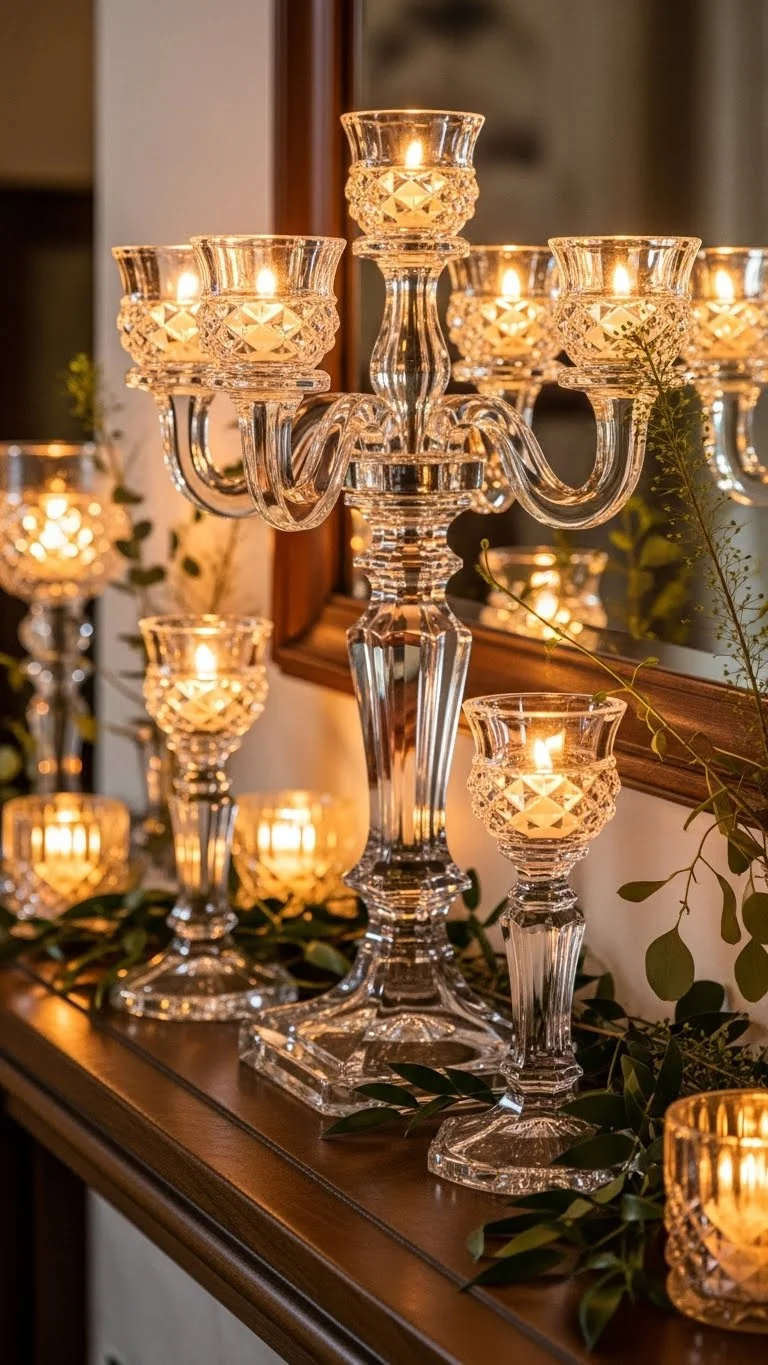 Crystal pieces add sparkle without feeling loud. Place a few candle holders on the mantel or dining table. Use tall candles in muted shades like ivory or taupe. The glass reflects the light beautifully, especially at night. If you want something budget-friendly, look for glass candle holders at thrift stores and mix sizes. Grouping them together gives a more refined look than spacing them out. Add small sprigs of greenery around the base for a simple touch. Avoid scented candles to keep things clean and understated. The glow adds warmth and sets a calm mood.