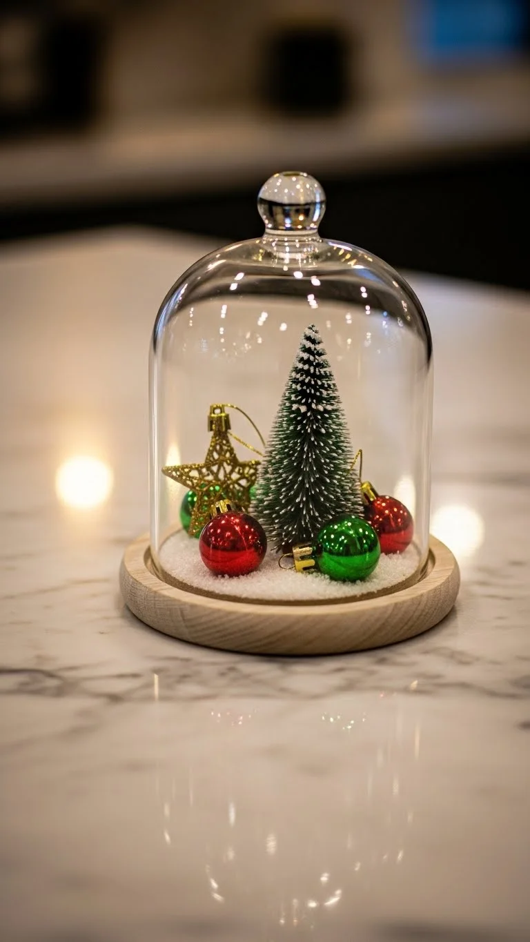 Glass cloches create museum-like displays. Add ornaments, pinecones, or LED candles inside. Place them on side tables, mantels, or shelves. You don’t need many—one or two is enough. For a budget approach, use clear glass jars or vases as substitutes. Add a mirror under the cloche to reflect light upward. This gives a soft glow. Keep the items inside simple so the display feels intentional. It’s a small touch that creates a sense of elegance.
