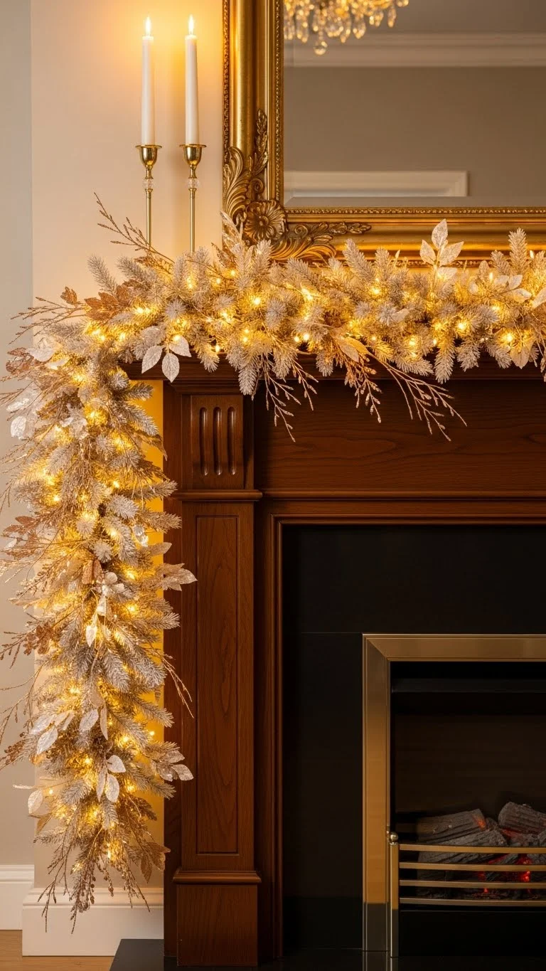 Champagne tones bring gentle shine. Use garland with soft gold branches, pale metallic berries, or frosted leaves. Drape it across the mantel or along shelves. Add a few warm lights for depth. If you want a DIY idea, spray cheap garland with light champagne paint for a muted look. Keep the rest of your décor neutral so the garland stands out softly. This color works beautifully with marble, wood, or modern interiors.