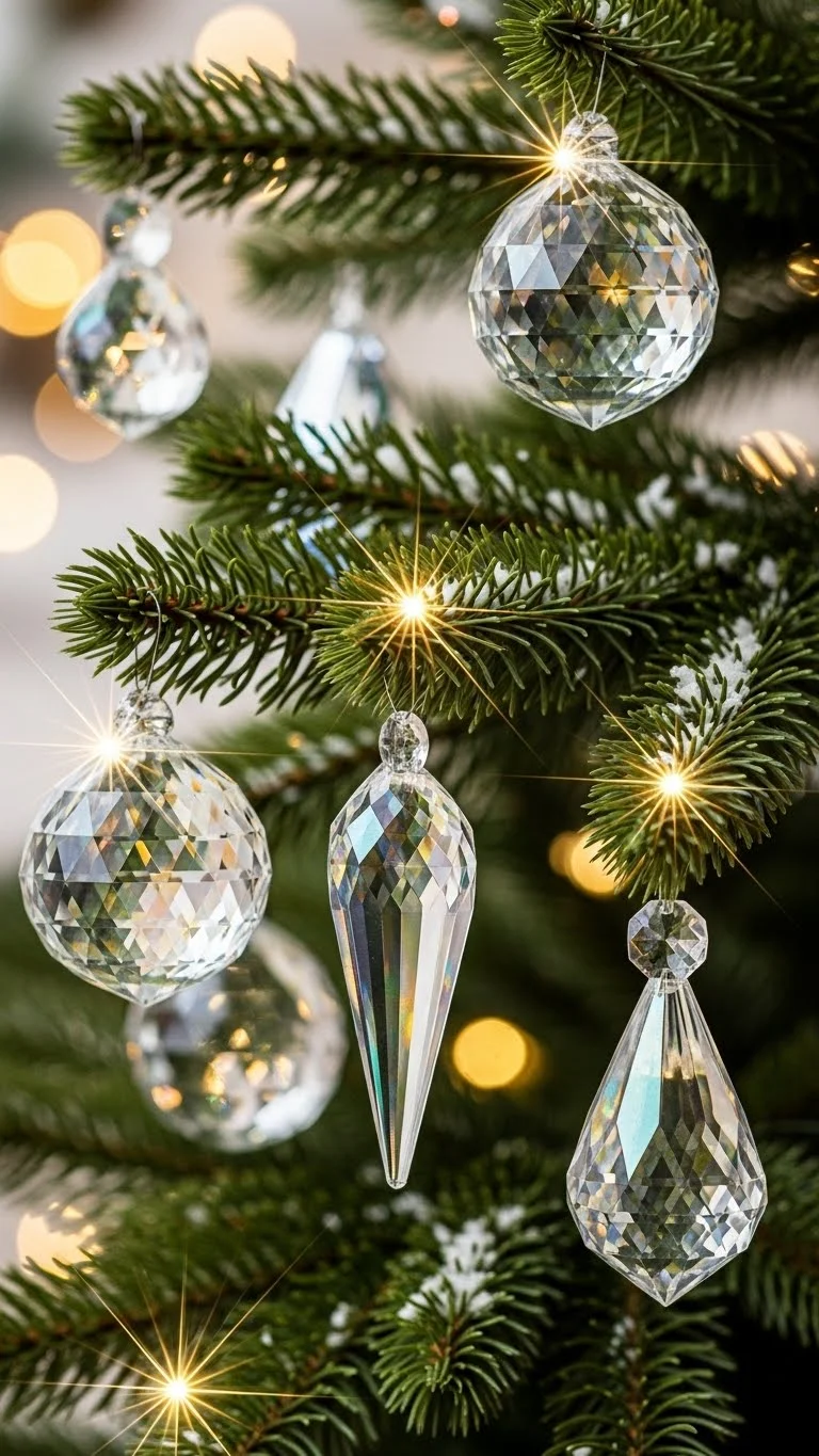 Crystal ornaments catch the light in a soft, sparkling way. Scatter them throughout your tree or hang a few on branches placed in a vase. They make even basic greenery look expensive. For a lower cost option, use acrylic “crystal look” ornaments—they look just as good from a distance. Mix in a few metallic pieces to balance the shine. Avoid adding too many colors so the effect stays calm and clean.