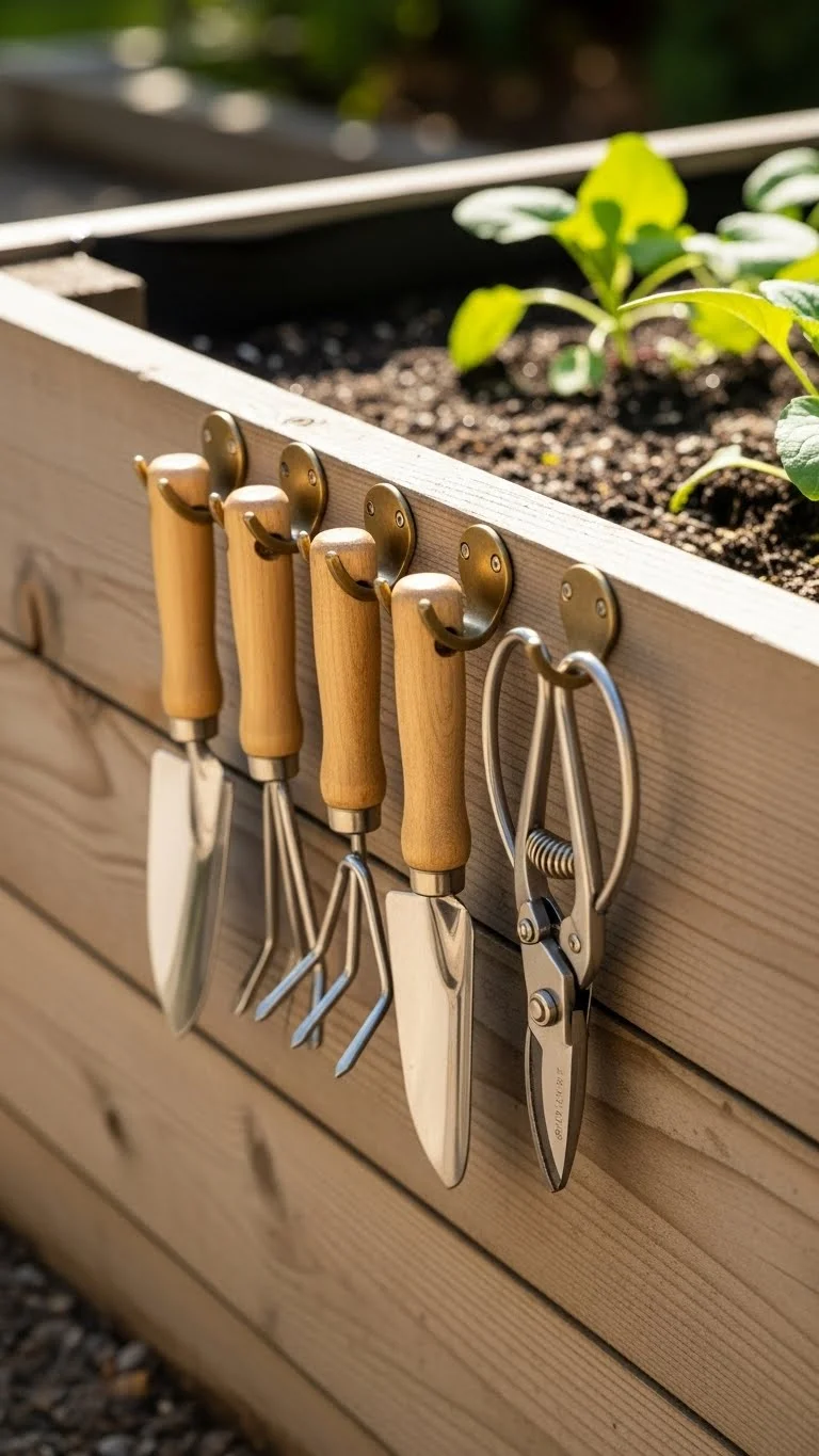 Rail hooks save time. Attach them to the side of your bed so tools stay within reach. You can hang scissors, gloves, or a hand trowel. This keeps your space clean and stops tools from getting lost. Hooks are cheap and easy to install. If you prefer a rustic look, use bent nails or scrap metal. The goal is to keep everything close so gardening stays smooth and enjoyable.