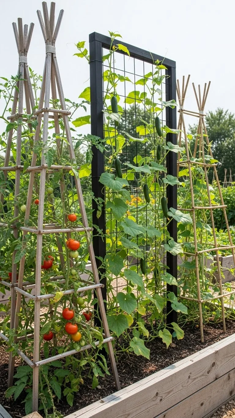 Vertical add-ons help you fit more plants without widening your beds. Simple trellises, mesh grids, and arch panels give vines a place to climb. You can build them from leftover wire fencing or a few wooden stakes. Taller items like cucumbers or pole beans grow clean and straight on supports. This frees the bed surface for herbs and leafy crops. The airflow also keeps leaves dry. That reduces fungal trouble and helps everything stay healthy. Try placing the vertical frame on the north side so it doesn’t cast heavy shade over smaller plants. Make sure the stakes sit deep in the soil or screw them to the bed frame for stability. Vertical add-ons also make harvesting easier because fruit hangs at eye level. A small investment in supports can reshape your entire layout and help every square inch work harder.