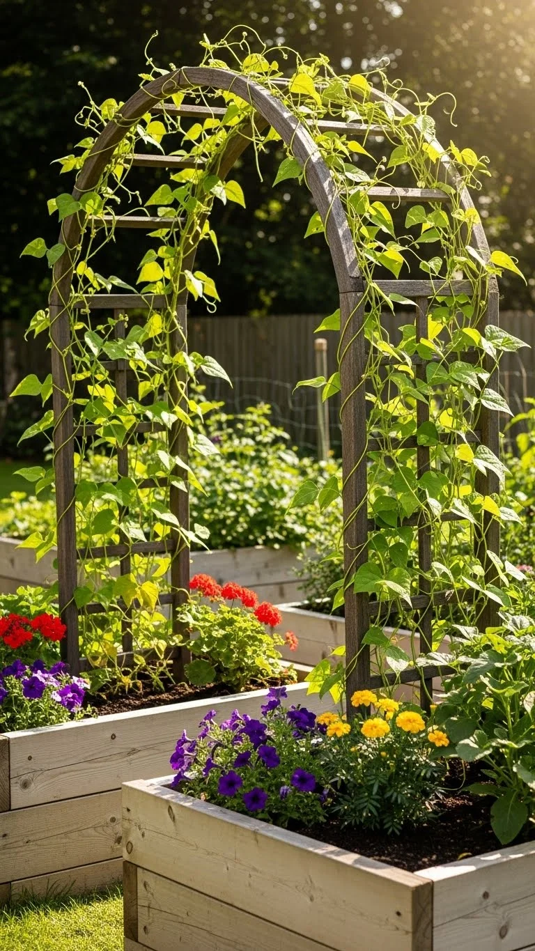 An arch between two beds creates a living tunnel. This gives climbing crops space to stretch upward. You can build the arch using cattle panels or strong mesh. Position the ends inside each bed and secure them with stakes. This setup creates shade beneath the arch where you can grow cool-loving crops. It also creates a beautiful focal point in the garden. Arches help you use height instead of expanding outward.